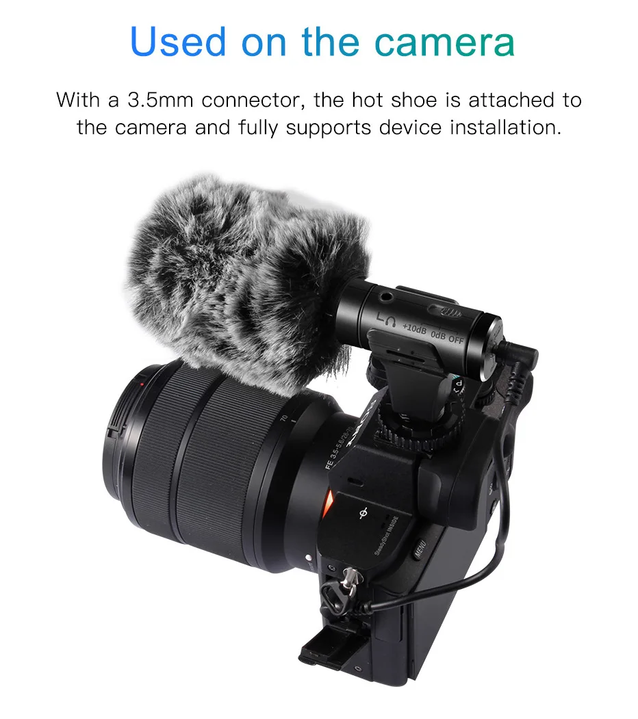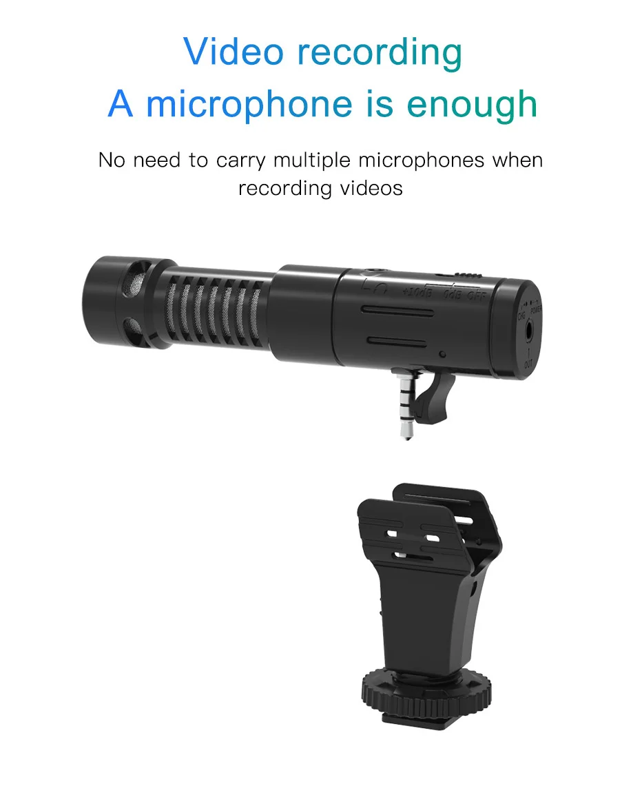 Model: MIC-07 Camcorder Microphone Name: Photography Rcondenser Audio Recording Microphone Practical Occasion: Digital/SLR Camera, Mobile Phone, Camera Shooting, Interview Recording, etc. Main Feature: 1. Microphone is lightweight and Portable, Built-in Rechargeable Lithium Polymer Battery, Plug and Play. 2. Built-in High-performance Super-cardioid Pickup, Ultra-wide Radio, Clearer Recording. 3. NCR Sound-reduction Technology, with Superior Noise Floor Suppression. 4. Support Headset Real-time Monitoring Microphone. 5. External ldquo+10dBrdquo Sensitivity Enhancement Switch, Increase the Microphone Volume, Improve the Pickup Range, Audio Recording is Better and Clearer, 0 dB is the Normal Pickup State. 6. The Indicator Light is Always on, Low Voltage will Alarm Prompt. When the LED is Blue, it is working. When the Red Light is Flashing, the Prompt should be Charged. When the battery is fully charged, the red is automatically turned off, which is the charging indicator.It can work continuously for more than 10-15 hours when fully charged. (The battery can continue to work for le1 hour when the battery is low). 7. Highly Sensitive, Compatible, Omnidirectional Microphone with 3.5mm Connector, Secure the hot shoe on the camera to fully support device installation. 8. Microphone output hole for connecting cameras, mobile phones, etc. 9. Micro-USB Charging Port, which can insert DC 5V le 2000mAh USB adapter or computer USB port to charge the microphone. Product Parameters: Monomer: Electrostatic Type Condenser Head Directivity: Super-cardioid Pointing