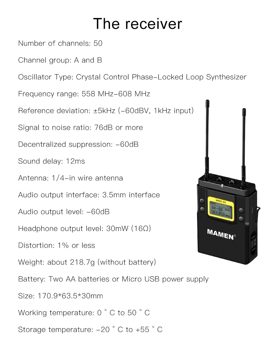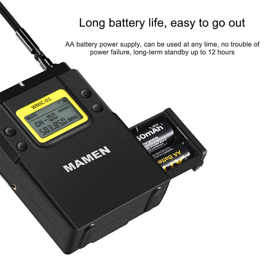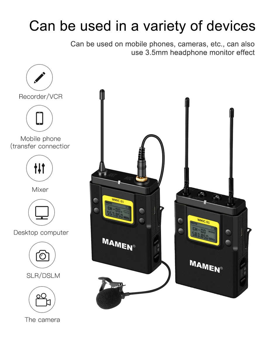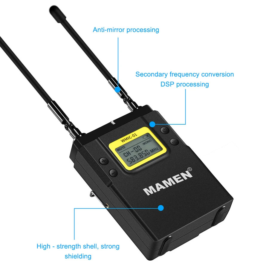 | MAMEN Professional Wireless Microphone UHF Dual Channel Super HD 530-590MHz Recording Microphone 60-100m Reception distance |