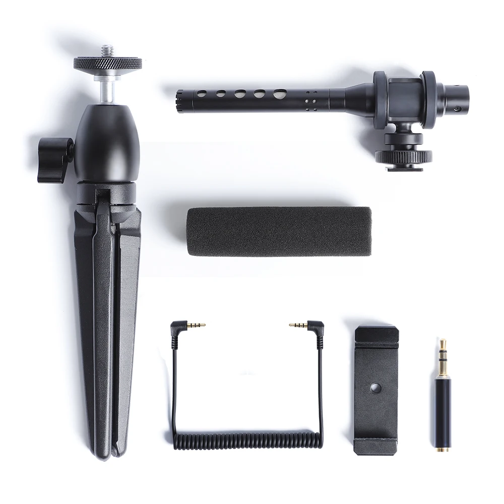 1xmicrophone, 1xflexible Smartphone clamp, 1xwind muff, 1xadapter, 1x user manual